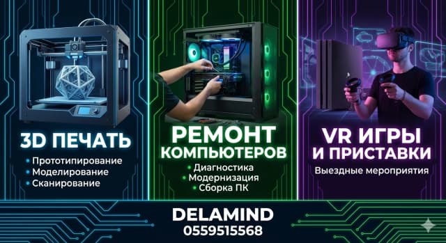 🚀 Delamind: Ваша Технологическая Мастерская! 🚀 Мы знаем, как важно, чтобы техника работала безупречно, а идеи воплощались в реальность! 💡 В Delamind мы предлагаем полный спектр услуг, которые помогут вам оставаться на пике технологий и получать максимум удовольствия от мира VR. Что мы предлагаем? 🛠️ 3D ПЕЧАТЬ: Воплощайте идеи! Мечтаете о уникальной детали, прототипе или эксклюзивном сувенире? Мы к вашим услугам! • Прототипирование: Быстро создадим рабочие образцы ваших разработок. • Моделирование: Разработаем 3D-модели любой сложности по вашим чертежам или идеям. • Сканирование: Оцифруем существующие объекты для последующей модификации или печати. 💻 РЕМОНТ КОМПЬЮТЕРОВ: Ваш ПК как новый! Не позволяйте поломкам замедлять вас. Мы вдохнем новую жизнь в ваш компьютер! • Диагностика: Точно определим причину неисправности. • Модернизация: Увеличим производительность и актуальность вашего ПК. • Сборка ПК: Соберем компьютер мечты под любые задачи и бюджет. 🎮 VR ИГРЫ И ПРИСТАВКИ: Погрузитесь в новые миры! Откройте для себя захватывающие виртуальные миры и устройте незабываемый праздник! • VR-игры: Лучшие VR-развлечения для всех возрастов. • Выездные мероприятия: Устроим VR-зону на вашем празднике, корпоративе или дне рождения! 📞 Свяжитесь с нами сегодня, чтобы узнать больше и получить консультацию! Delamind Телефон: 0559515568