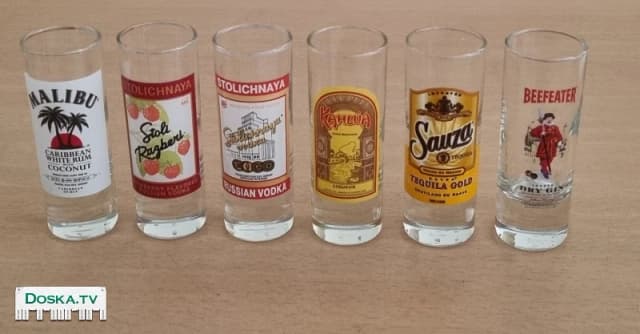 набор коллекционных рюмок Luminarc с этикетками различных ликеров. Высоту примерно 10,5 см и диаметр 3,8 см . пивные кружки и чашки