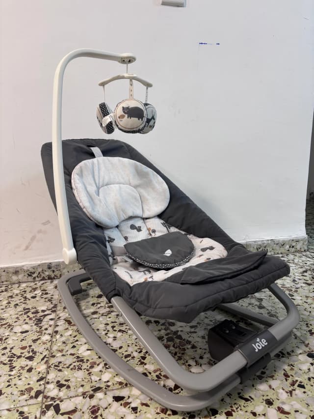 Кресло качалка фирмы Joje. Все работает. Есть музыка и вибрация. Очень удобно с рождения и вовремя ввидения прикорма, когда ребенок еще не сидит самостоятельно.