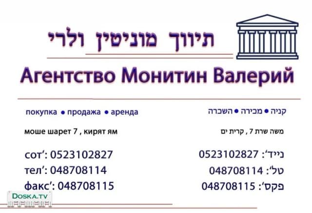 Компания "Монитин" Валерий все виды услуг с недвижимостью и юридическое сопровождение! 1. все операции с недвижимостью в Израиле и за рубежом 2. помощь в получении ипотеки и полное сопровождение 3. помощь в открытии счетов в Израильских банках и за рубежом 4. помощь в переводе средств в Израиль и за рубеж 5. полное юридическое сопровождение во все инстанции 6. перевод и заверение документов на все языки для всех стран 7. более 17 лет опыта и репутации, связи во всех инстанциях и во многих странах, все официально, Лицензия Министерства Юстиции Израиля. Нас Знают, Нам Доверяют, Мы Проверены Временем и Многими Довольными Клиентами Из Разных Стран !