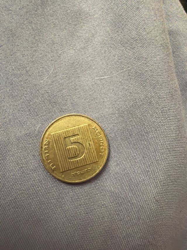 Это старая израильская монета номиналом 5 агорот. На стороне, изображённой на фотографии, можно увидеть цифру «5» в центре внутри квадратной рамки с горизонтальными линиями, а вокруг на иврите написано «агорот», а также слово «Израиль». Монета относится к денежной системе Израиля и использовалась в основном в прошлом, до того как прекратили выпуск и использование таких мелких номиналов. В настоящее время она считается скорее ностальгическим или коллекционным предметом, чем монетой для повседневного обращения. זו מטבע ישראלית ישנה בערך של 5 אגורות. בצד שמופיע בתמונה ניתן לראות את הספרה "5" במרכז בתוך מסגרת מרובעת עם קווים אופקיים, וסביבה כתוב בעברית "אגורות" וכן הכיתוב "ישראל". המטבע שייך למערכת המטבעות של ישראל, והיה בשימוש בעיקר בעבר לפני שהפסיקו לייצר ולהשתמש בערכים קטנים כאלה. כיום הוא נחשב לפריט נוסטלגי או לאספנים יותר מאשר למטבע בשימוש יומיומי.