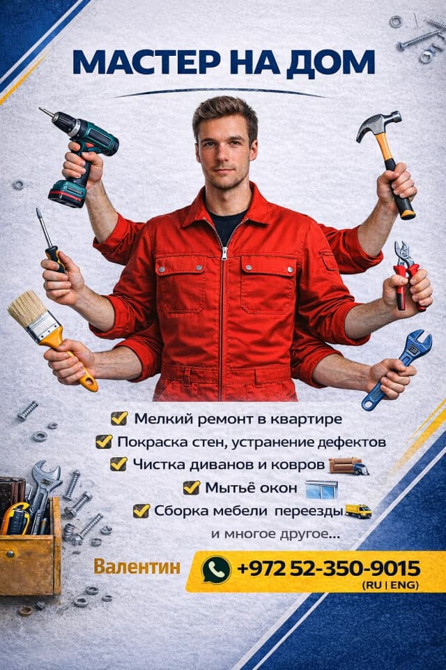 Привет! - небольшой бытовой ремонт - покраска стен - сборка мебели - химчистка мягкой мебели Гуш Дан и окрестности!