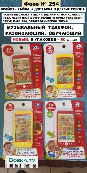 Музыкальный Телефон. Развивающий. Обучающий - - это развивающая и музыкальная игрушка на русском языке. Есть песни, потешки, сказки, стихи, фразы. Смартфон предназначен для обучения и развития, помогает улучшить мышление ребёнка. Новый, в упаковке. : Любимые сказки и песни; Песни и стихи С. Михалкова; Песни Шаинского; Песни из мультфильмов и стихи С. Маршака. Голографический экран. Новый, в упаковке. Цена = 50 ש / штука. Нахожусь в Крайот - Хайфа. + Доставка в другие города.