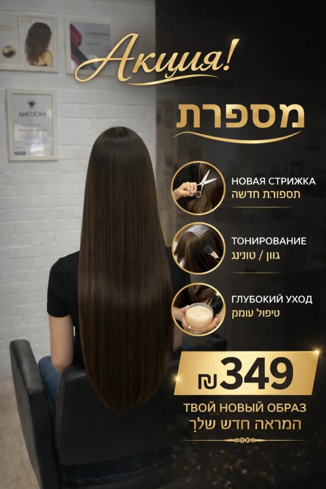 Ищете мастера по уходу за волосами, которому можно доверять? Я — практикующий hair-эксперт с опытом в восстановлении и выпрямлении волос, работаю бережно и на результат. ✨ Мои услуги: • Женские стрижки (в том числе каскад, коррекция формы) • Окрашивание: тон в тон, работа с корнями • Биозавивка • Нанопластика / органическое выпрямление (без формальдегида и резкого запаха) • Ботокс для волос • Восстановление и реконструкция волос • Пилинг кожи головы 💎 В работе: — индивидуальный подход к каждому клиенту — подбор процедур под тип и состояние волос — щадящие составы — аккуратная техника и внимание к деталям 📍 Принимаю в Bat Yam (Shalom Aleichem 11) Уютная атмосфера, комфорт и качественный результат Моя цель — не просто сделать процедуру, а улучшить качество ваших волос: мягкость, блеск, здоровье и ухоженный вид. 📩 Запись в личные сообщения Буду рада помочь вам преобразить ваши волосы