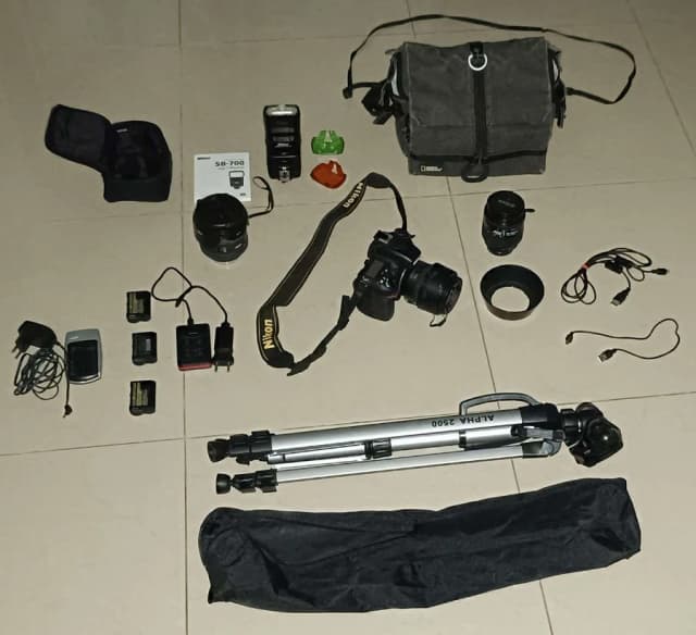-Полностью рабочая электронно-цифровая многофункциональная видео и фото камера Nikon в хорошем состоянии . -С встроеной мини-вспышкой , и отдельной вспышкой SB-700 с оригинальной сумкой/чехлом к ней и с насадками разных цветовых фильтров . В комплект входят восемь 1.5-вольтовых для вспышки запечатанных и абсолютно новых уникальных батареек фирмы Sigma Power & Energy AA R6S. -В камере используется объектив Nikon . Ещё в комплекте имеются два дополнительных объектива фирмы Sigma и Nikon ( с задними крышками ), каждый из трёх объективов - со своим функционалом . На каждом из трёх объективов имеются фильтры разных фирм и насадки затемнители . -Камера снимает видео со звуком и фото на вставляемый чип памяти . В комплекте имеется чип на 32 Гигабайта . -Ещё имеются - 3 батарейки и две зарядки для батареек . -Так-же в комплект входит два шнура для переноса цифровых данных на другие устройства через USB . -В добавок к комплекту идёт вместительная сумка фирмы National Geographic с дополнительным чехлом , в хорошем состоянии и вполне подходящая для всех компонентов и комплектующих аппарата Nikon . -В комплекте добавочно имеется штатив с чехлом фирмы Alpha 2500 в идеальном состоянии . В итоге имеется : -Цифровая видео/фото-камера с встроенной вспышкой . -Отдельная вспышка SB-700. -Объектив M-5 Nikon Zoom-Nikkor 18-70 мм f/3.5-4.5 AF-S DX SWM IF ED G Aspherical 067 + Sonia Safety Filter 67mm. -Объектив Sigma 17-35mm f/2.8-4 EX DG AF + Ультрафиолетовый защитный светофильтр Haida Mc-Uv Pro II 77mm. -Объектив Nikon AF Nikkor 28-105mm 1 3.5-4.5d + Ультрафиолетовый защитный светофильтр Haida Mc-Uv Pro II 62mm. -Чип памяти на 32 ГГ. -Три батарейки для аппарата Nikon. Batmax 7.0V 2280mAh/16Wh. -Две зарядки для батареек. -Два USB кабеля. -Сумка фирмы National Geographic. -Штатив фирмы Alpha 2500.
