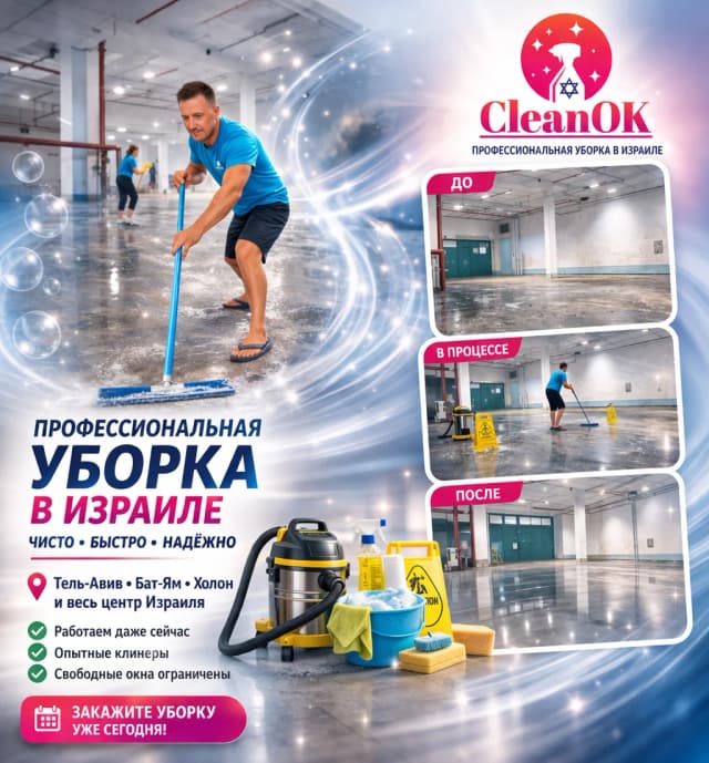 Профессиональная уборка от команды CleanOK (Клинок) Работаем по центру страны: Тель-Авив, Холон, Бат-Ям и др. Предлагаем: — генеральную уборку — регулярную уборку — уборку после ремонта — окна и химчистку мебели 💰 от 350 ₪ за 4 часа 📩 Напишите нам — быстро ответим и запишем