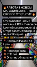 🔥 РАБОТА В НОВОМ МАГАЗИНЕ JUMBO — СКОРОЕ ОТКРЫТИЕ 🔥 Открывается новый магазин JUMBO в Ришон-ле-Ционе (новая промзона) Старт работы примерно через 10-14 дней 📍 Локация: Ришон-ле-Цион 💥 Лёгкая работа — 💥 от 18 лет 💥 Опыт не обязателен 🔹 Должности: — кассир — 45 ₪/час — раскладка товара — 42 ₪/час — работа на складе внутри магазина (для мужчин) — 45 ₪/час 💰 Условия: — неофициальное трудоустройство: оплата каждую неделю наличными — официальное трудоустройство: оплата раз в месяц 🚍 Подвозок нет ( только после второй смены или в шаббат )— оплачивается проезд 📈 Доплаты: — пятница — 125% — суббота — 150% ⏰ График: Первые 2 месяца (период открытия): — 08:00–17:00 — пятница: 08:00–14:00 После открытия (смены): — 08:00–16:00 / 16:00–23:00 — пятница: 08:00–17:00 — суббота: 18:00–23:00 ☕ Есть перерывы в течение дня - перерыв не вычитают !!! Для регистрации пишите мне в лс ‼️‼️‼️‼️‼️